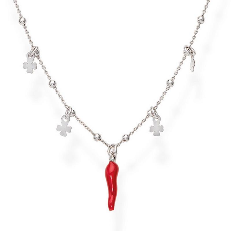 Brand: Amen; Collection: Cornetti; Article Code: CLCSQBR; Type of product: Necklace; Gender: Lady; Material: Silver, Red enamel; Color: Silver, Red; Subject: Lucky horn, Four-leaf clovers; Size / Measure: adjustable from 42 to 45 cm.